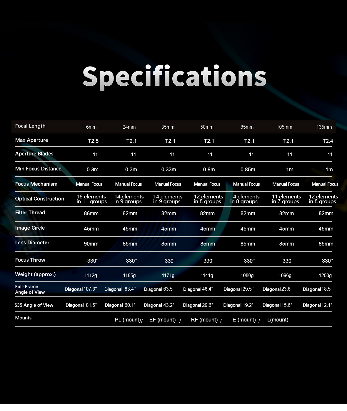 Fit:Sony-E Canon-EF / Panasonic-L/Professional Camera-PL