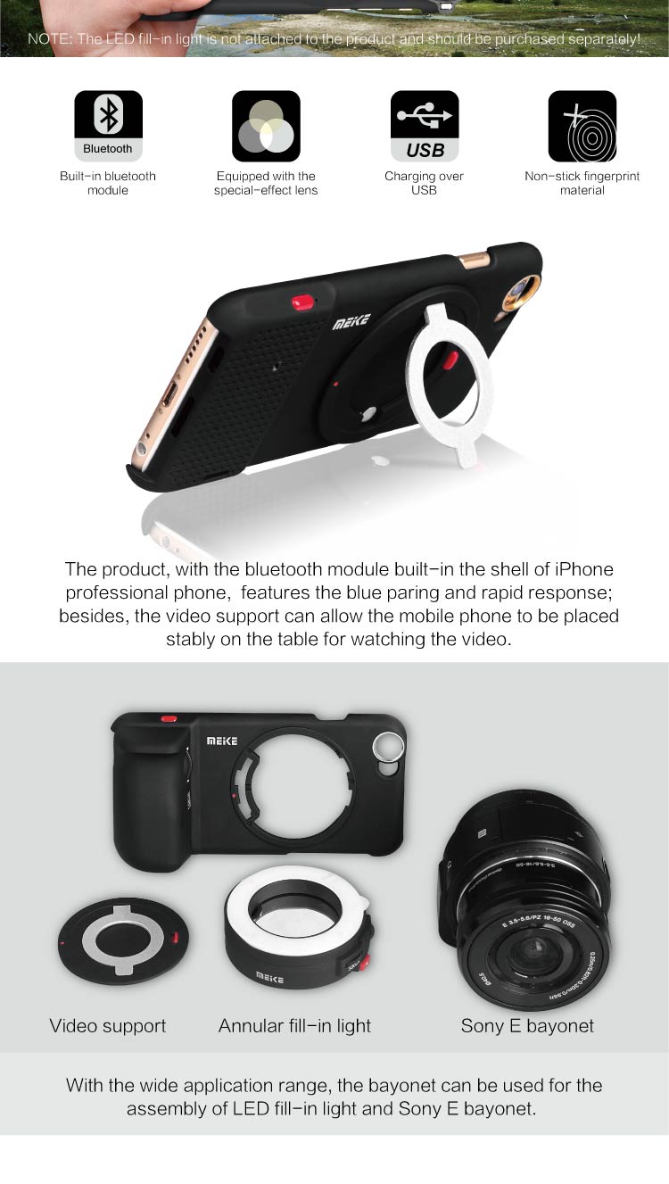 ◆ The product, with the bluetooth module built-in the shell of iPhone professional phone, features the blue paring and rapid response; besides, the video support can allow the mobile phone to be placed stably on the table for watching the video,And Equipped with the wide-angle, microspur and fish-eye lens for mobile phone.